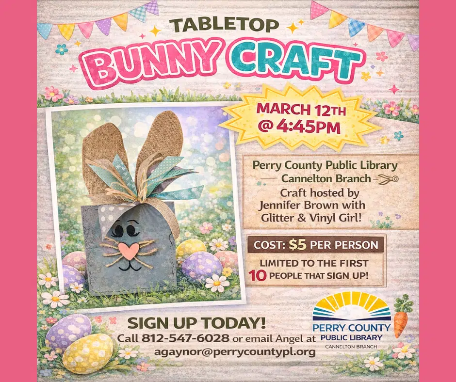 Join us at the Perry County Public Library β Cannelton Branch for a fun and creative Tabletop Bunny Craft workshop!