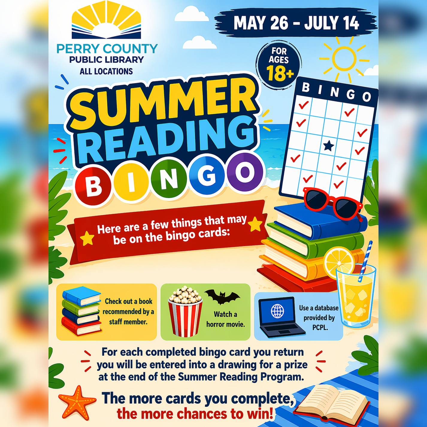 Join us for Summer Reading Bingo at the Perry County Public Library! Pick up a bingo card when you check out, complete fun activities, and earn chances to win prizes.