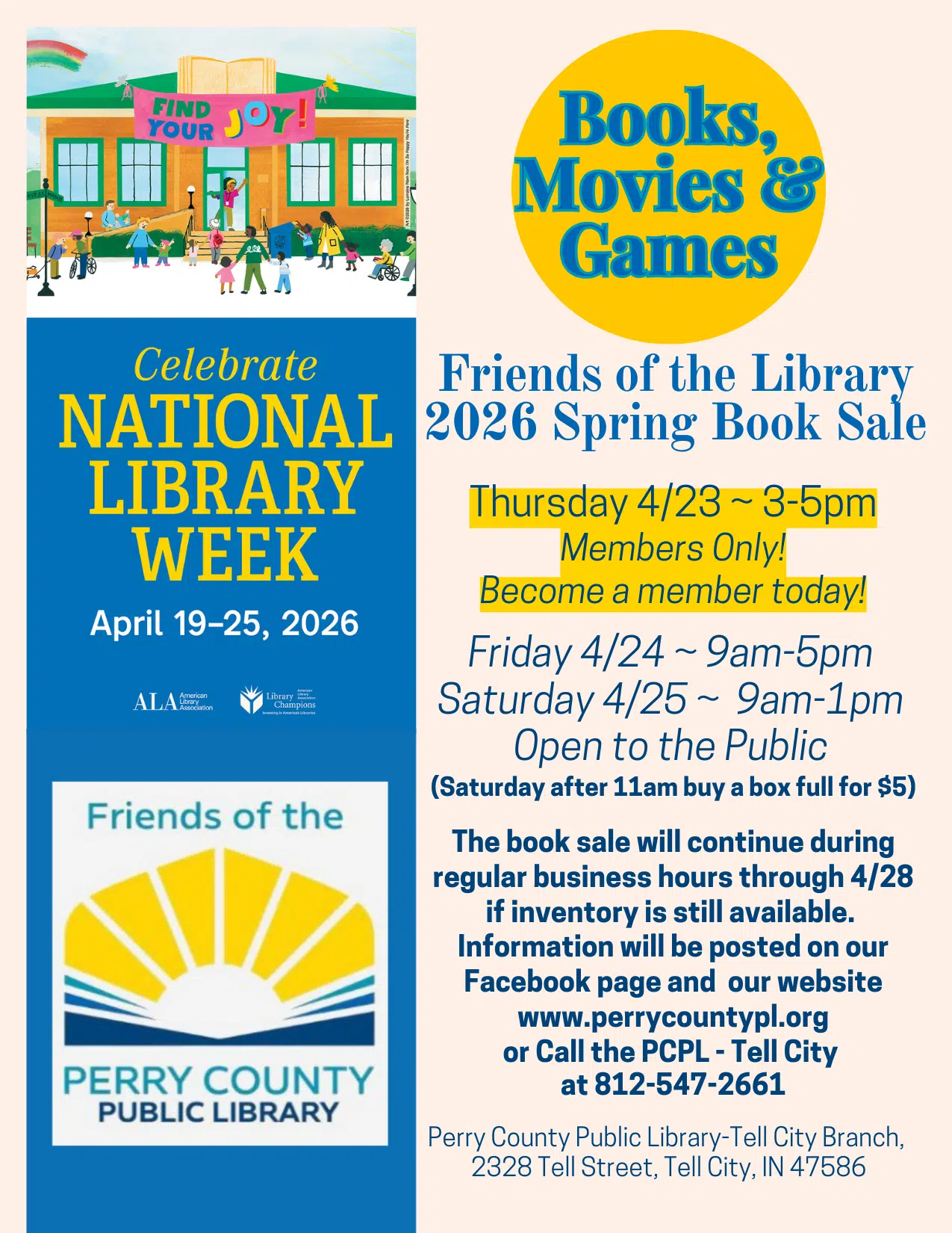 Mark your calendars! Our next Friends of the Library Book Sale will be held April 23β25, during National Library Week. This sale will be huge, and weβll also be hosting a silent auction.