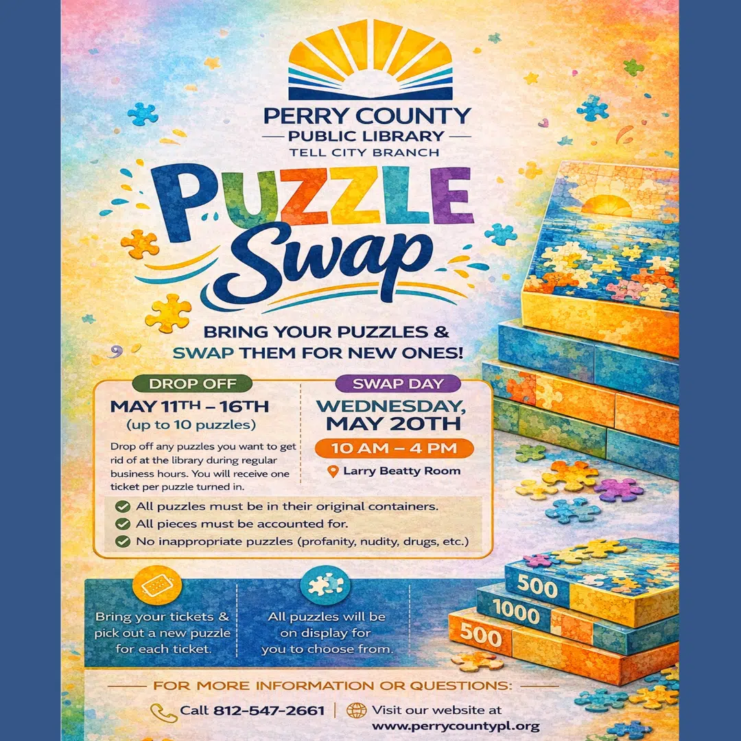 Ready to refresh your puzzle collection? Join us at the Tell City Branch for a fun and easy Puzzle Swap!