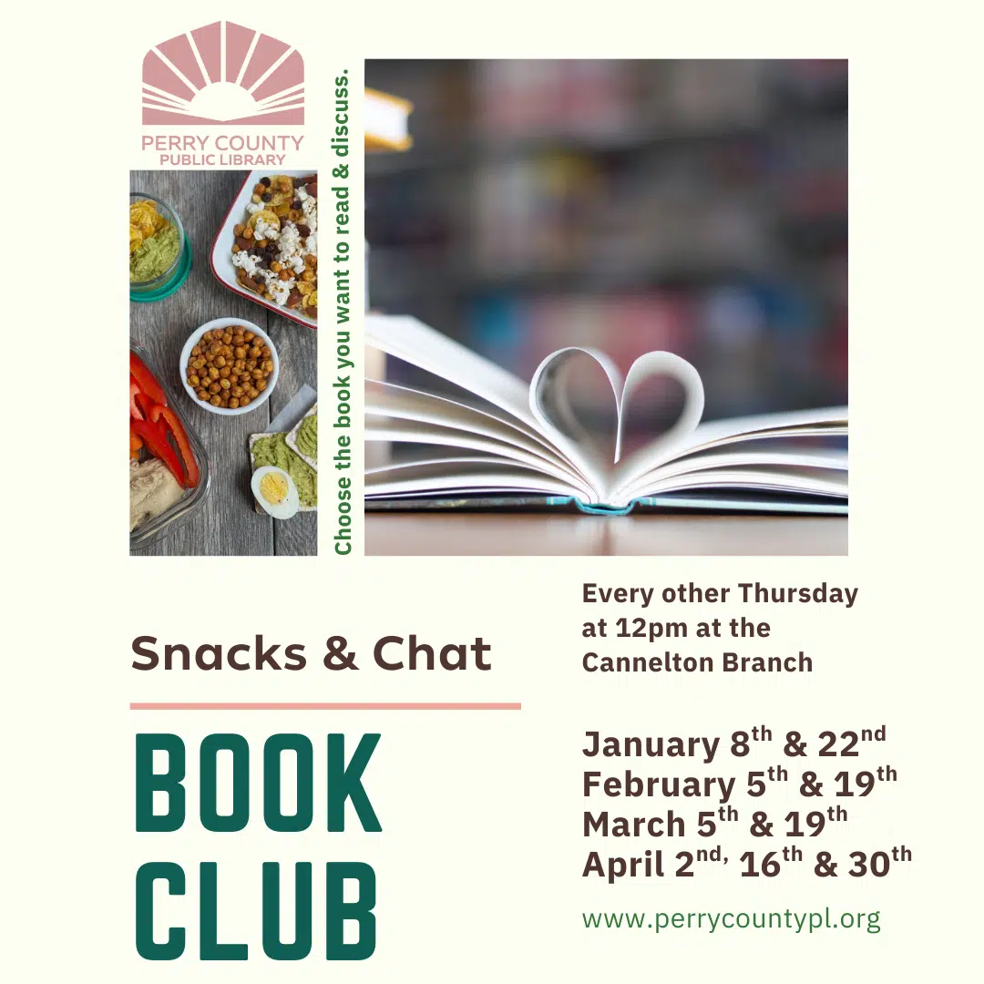 Looking for some adult time and book recommendations? ๐๐ช Come to our Cannelton location every other Thursday at 12:00 PM for our Snacks & Chat Book Club!